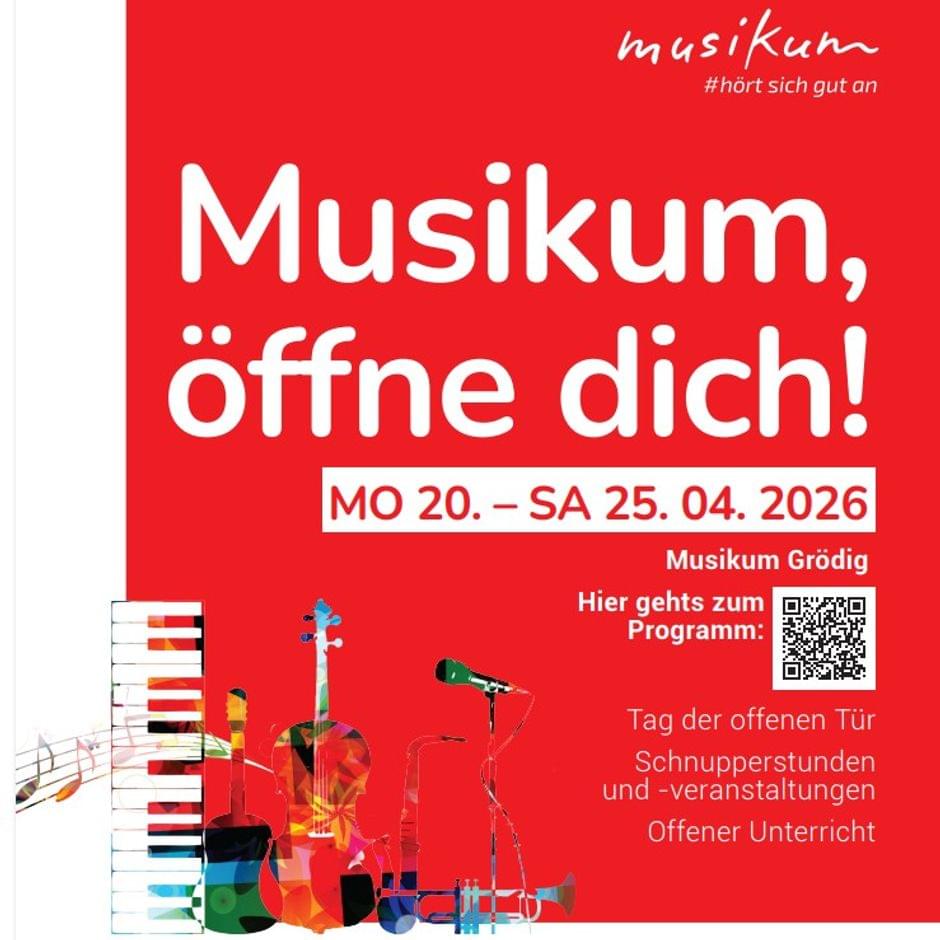 Musikum öffne dich lädt in der Woche von Mo 20. bis Sa 25. April 2026 an allen unseren Unterrichtsorten (Anif. Elsbethen, Fürstenbrunn, Grödig, Großgmain, Siezenheim, Wals, Walserfeld) ein. In dieser Woche können Sie mit Ihren Kindern ohne Anmeldung im Musikunterricht zuhören und zusehen, Informationen einholen sowie mit unseren Lehrenden in Kontakt treten und mit ihnen eine gratis Schnuppereinheit (je nach Verfügbarkeit) vereinbaren.