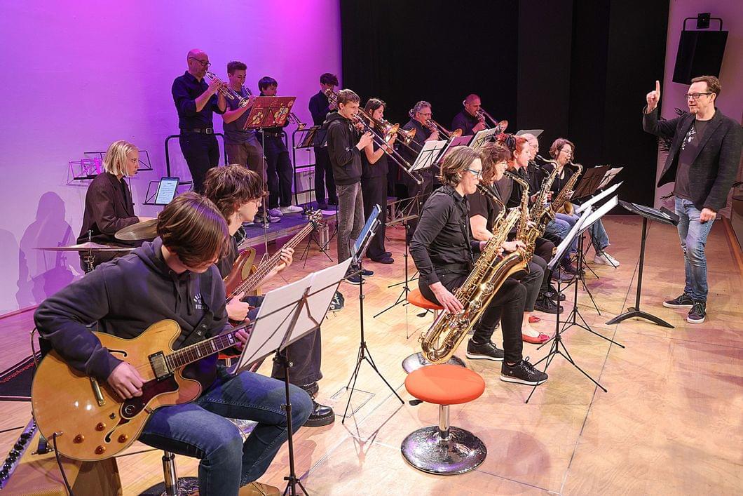 Schülerinnen und Schüler der Klassen für E-Gitarre + Schlagwerk + Klavier für Jazz + Pop geben ein gemeinsames Konzert und zeigen ihr Können auf der Bühne.