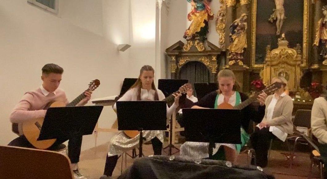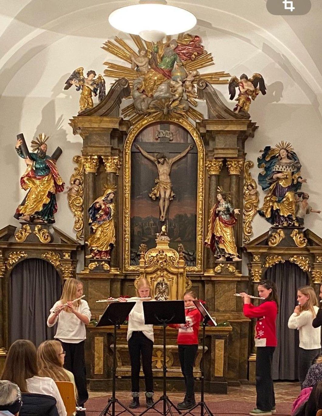 Schülerinnen und Schüler der Querflöten- und Gitarrenklasse geben ein Konzert in der Bürgerspitalkirche (schräg gegenüber vom Musikum Hallein)