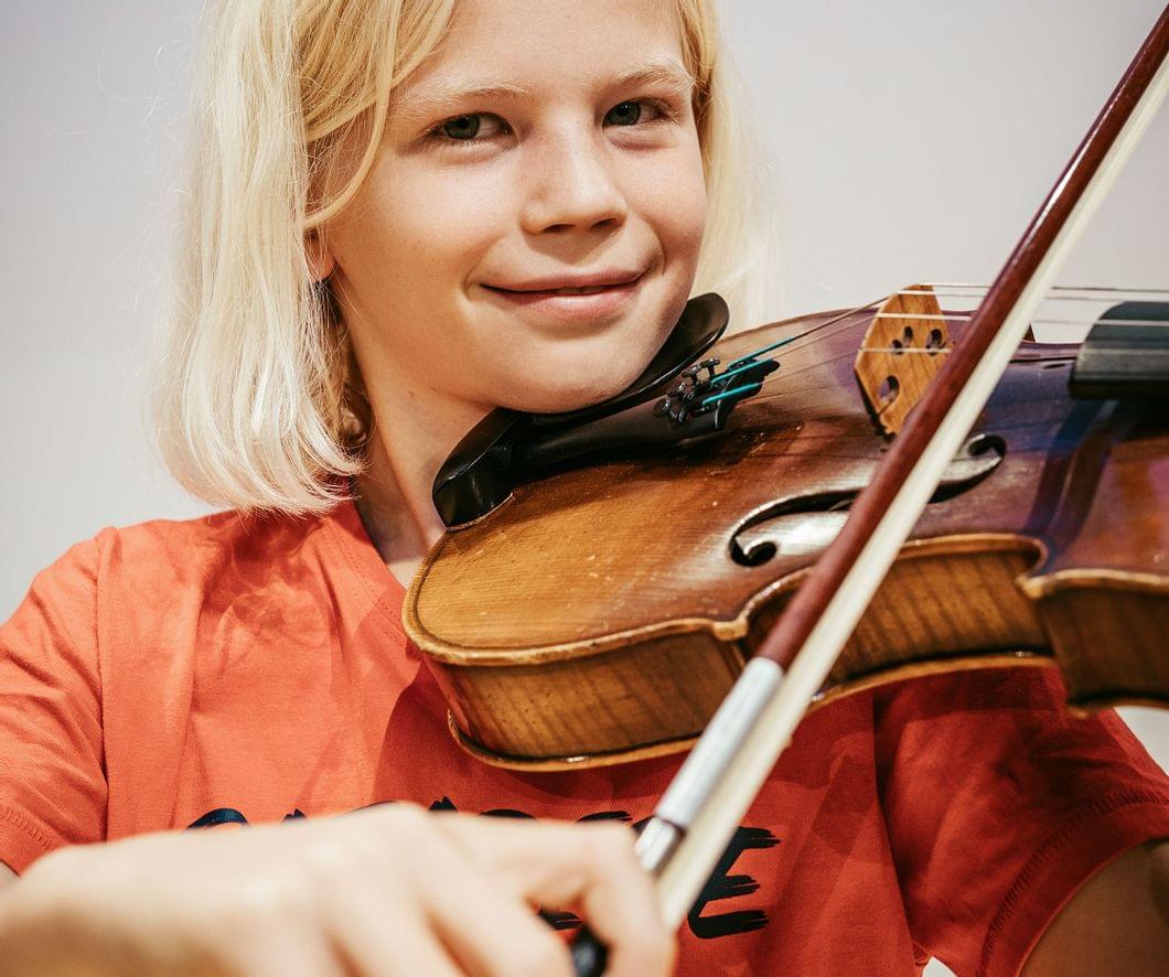 Schülerinnen und Schüler der Violinenklasse zeigen ihr Können auf der Bühne.