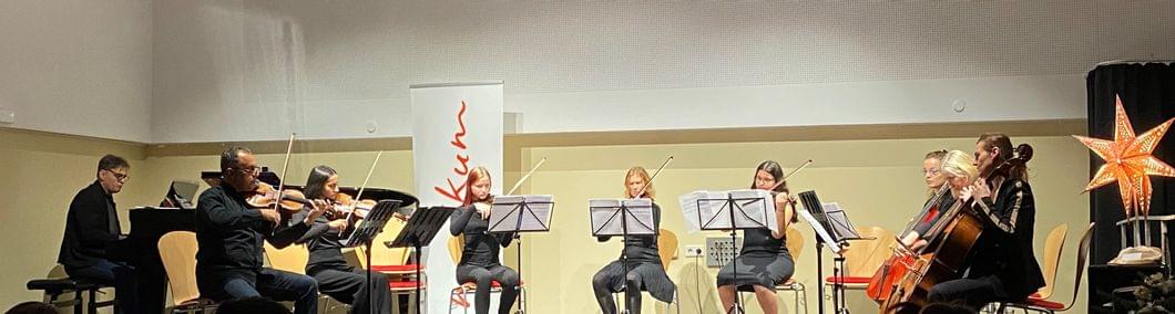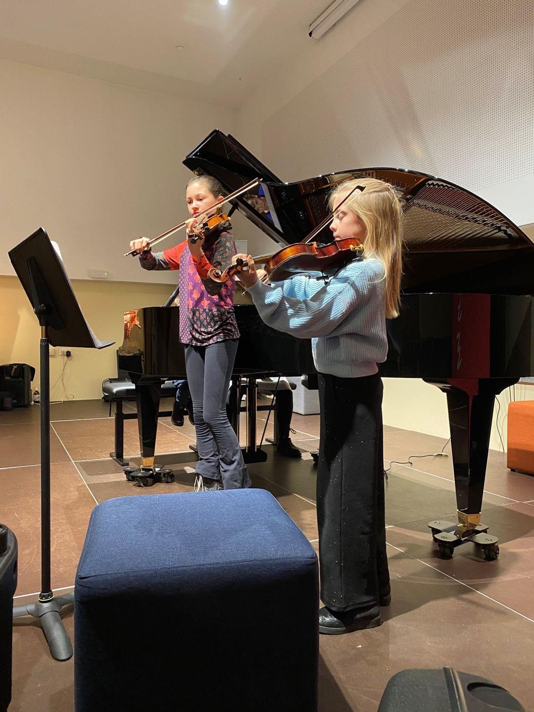 Schüler:innen der Klasse Nadim Khalaf (Violine) und der Klasse Elisabeth Haas (Cello) präsentieren zusammen ein Weihnachtskonzert.