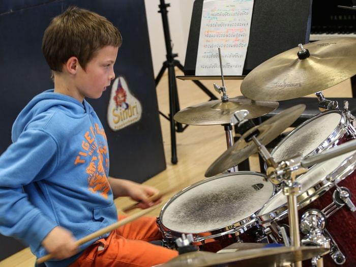 Als Drumset-Spieler:in bist du Dirigent:in einer Band. Ein Drumset besteht aus verschiedenen Instrumenten wie z.B. Snare Drum, Bass Drum, Toms, Hi Hat und Becken. Seine Beherrschung ist eine Kunst, die eine sehr gute Hand-Fuß-Koordination und viel Rhythmusgefühl erfordert, das du im Unterricht sehr gut lernen kannst. Du lernst verschiedenste musikalische Stile kennen wie z.B. Rock, Pop, Jazz, Latin und Hip-Hop und spielst live mit einer Band oder zu Playback.